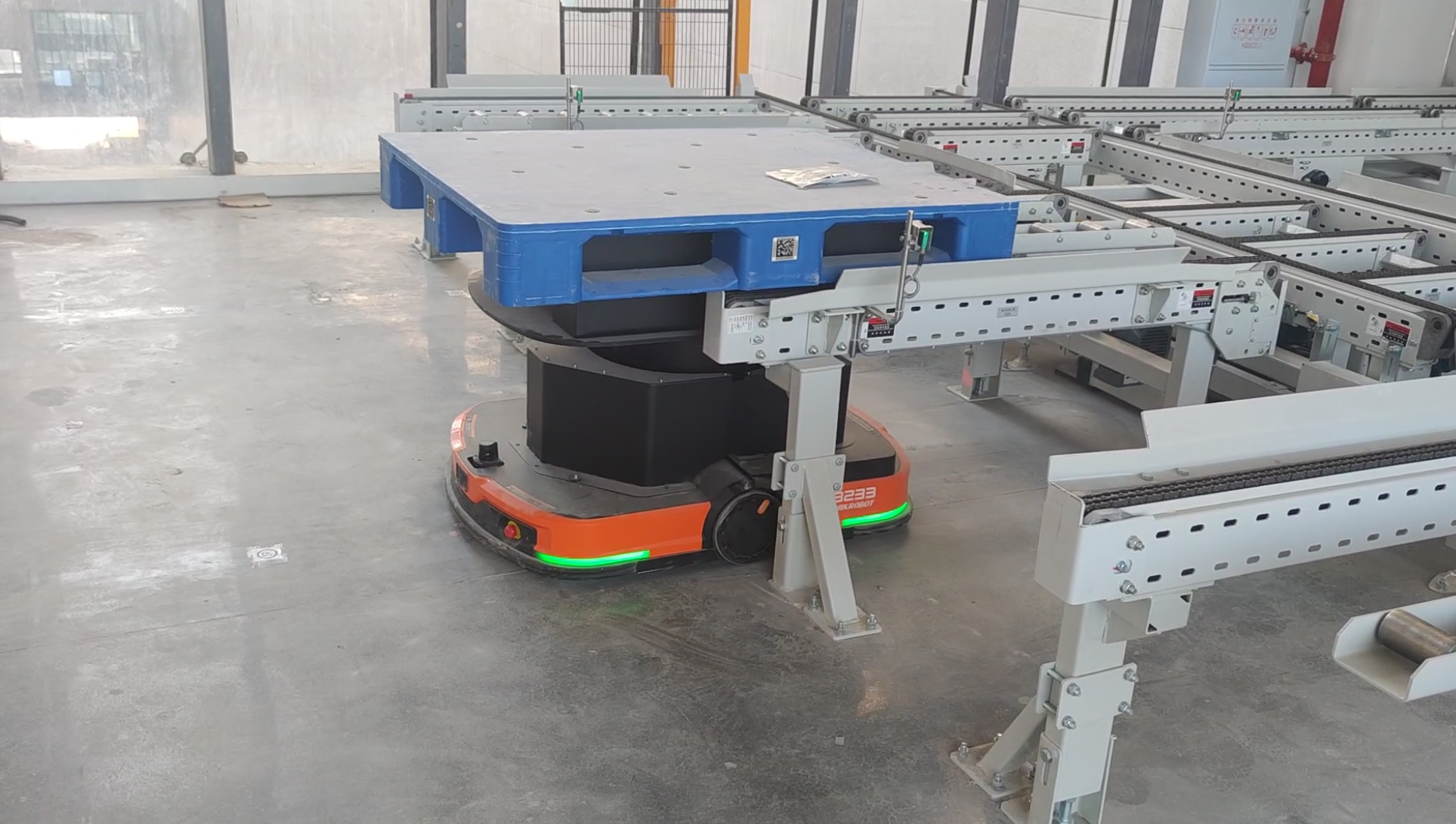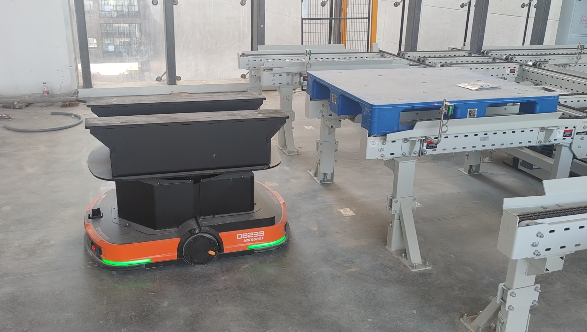 项目采用 “潜伏式搬运机器人+叉取式搬运机器人”的协同作业模式。目前,项目已完成首批3个楼层的硬件安装,并已进入关键的机器人系统调试与流程联调阶段。该阶段将重点验证 “潜伏机器人+叉取机器人”协同流程的稳定性:潜伏机器人负责产线与缓存站台间的柔性水平搬运,叉取机器人则承担站台与地面库区间的重载垂直转移,两者通过智能调度系统实现物料流的无缝衔接。