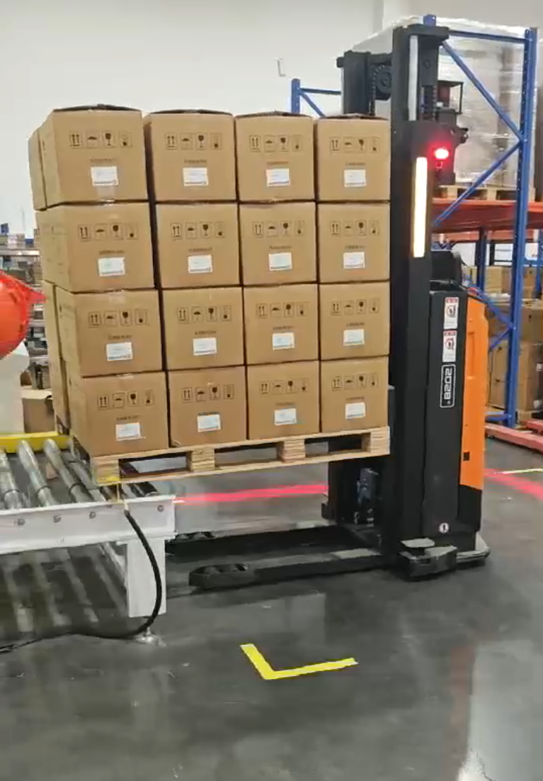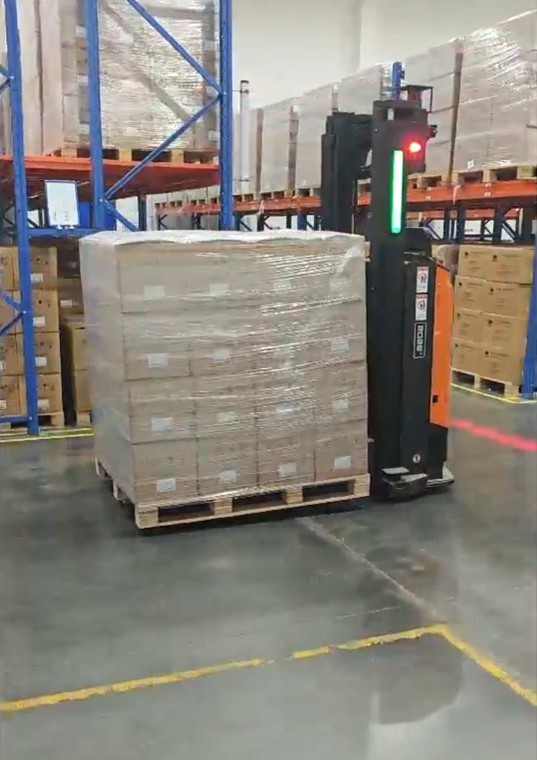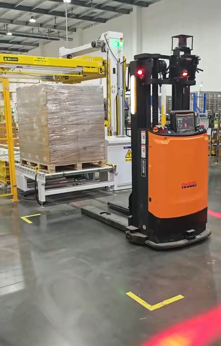 项目实现了完整闭环:成品下线后,系统调度潜伏或叉取机器人(根据场景)替代人工叉车,从指定垛位自动取货,并运送至缠膜机工位进行自动化打包;打包完成后,机器人继续将整托成品精准搬运至高层货架库区存储。