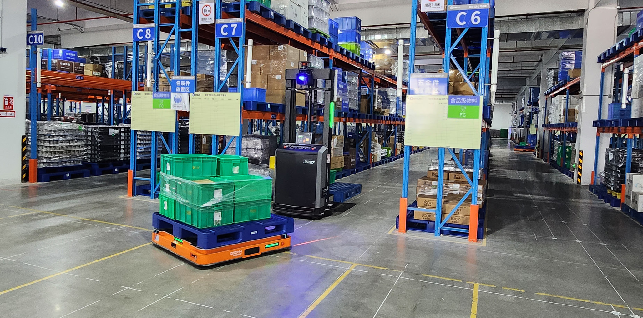 某小家电龙头企业产品涵盖电热水壶、咖啡机等多种电器,面对原材料、人工成本上升等挑战,该客户选择机器人作为其智能制造合作伙伴,为其提供潜伏举升车、潜伏叉车、无人叉车、CTU 等多种AMR 车型,实现其高库容、高效率的智能仓储及物料和成品配送应用。