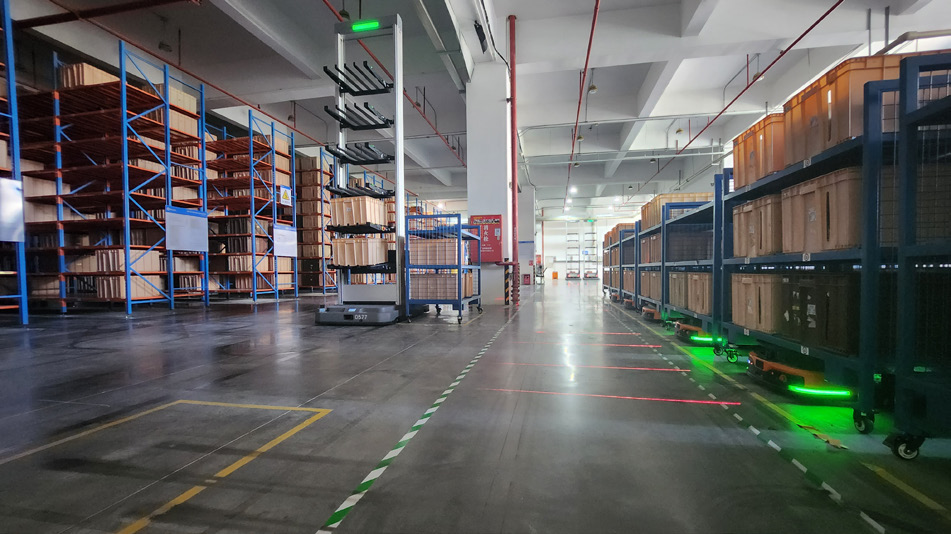 项目覆盖从原材料收货、质检、入库、分拣、跨楼层产线配送、成品入库全流程内物流场景;实现海康仓储管理系统 iWMS-1000 及调度系统 RCS-2000 与 ERP、QMS、APS、SRM系统无缝对接。RCS-2000 系统与提升机系统对接,自动实现了移动机器人与提升机交互,实现跨楼层转运的作业联动。
