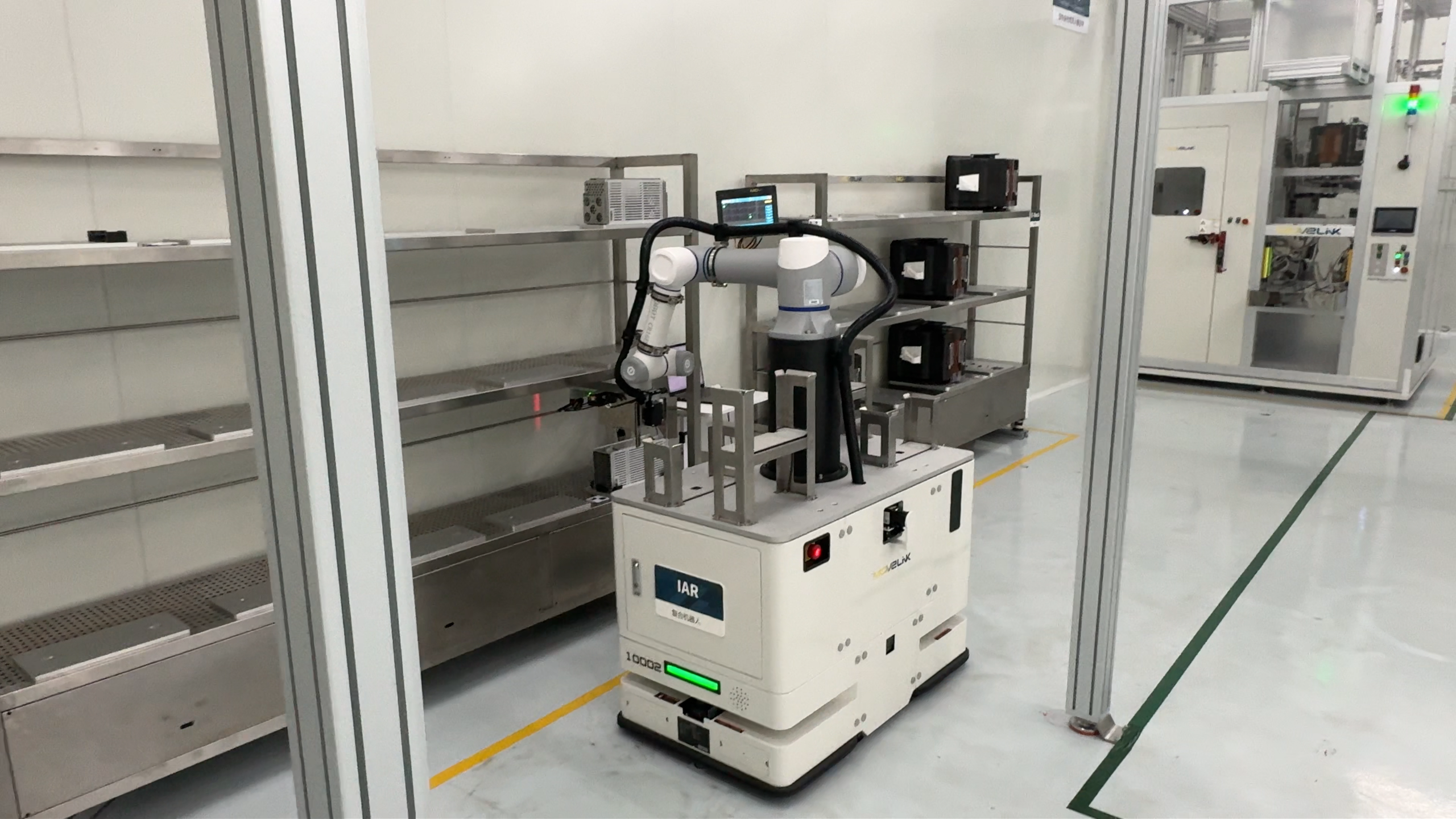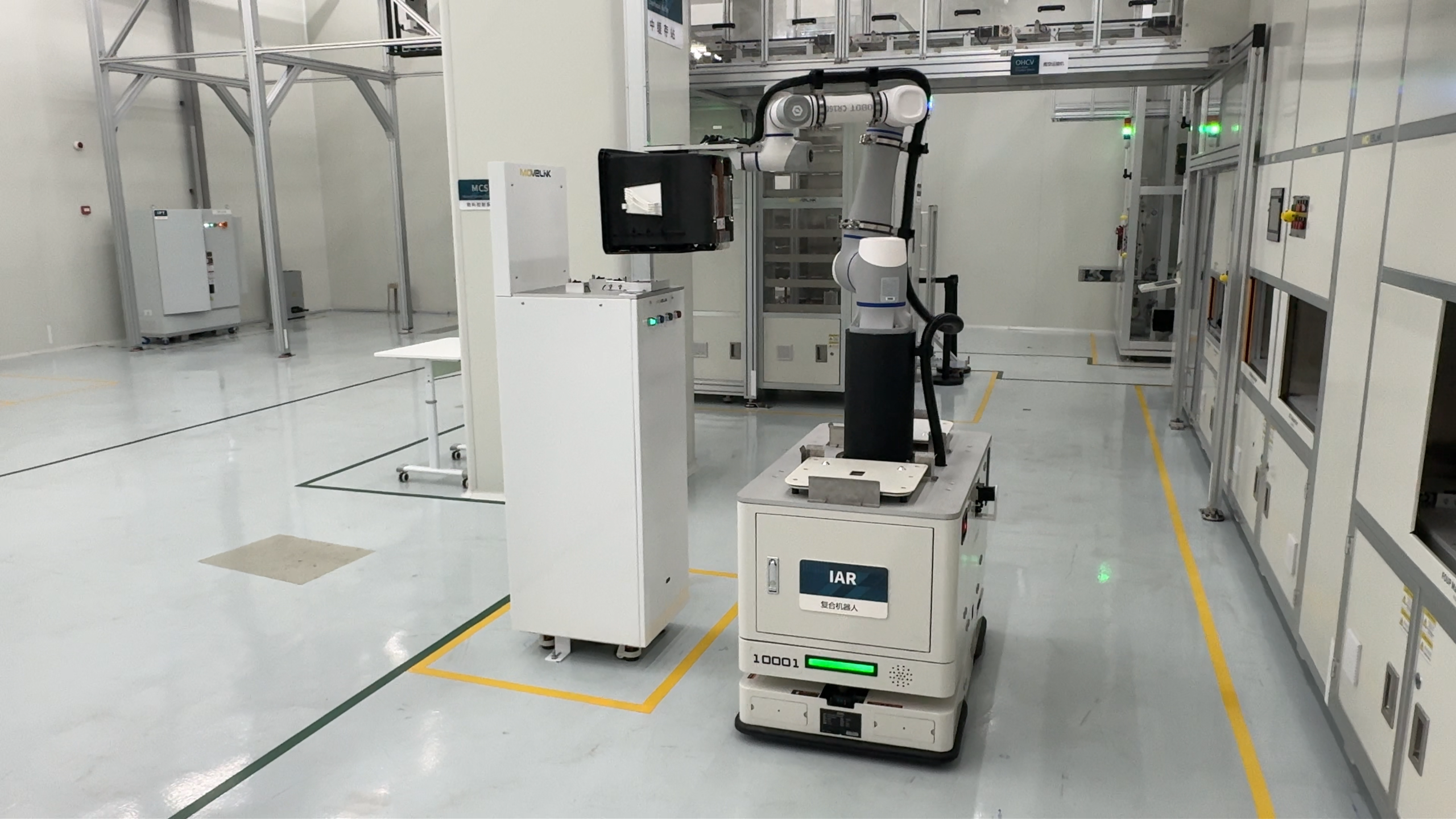 示范线核心聚焦于12英寸晶圆载具(FOUP/MGZ) 的自动化流转,系统设计确保了除立体存储库(Stocker)外,各设备站点的容载量均达到其物理设计的最大值。项目成功集成了 IAR(集成应用机器人,含配套充电桩)、E-Rack设备架、EQ工艺设备架 等关键模块,完整模拟了晶圆厂内从物料存储、设备间搬运到工艺设备上下料的真实场景。