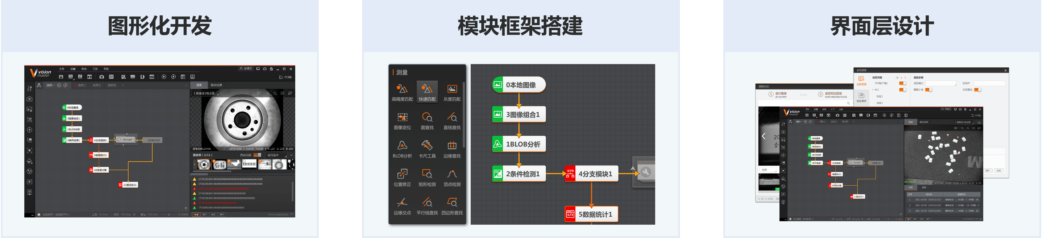 内置嵌入式版本VM,包含多种传统算法与深度学习算法,模块化设计方便用户自由进行视觉方案的搭建,检测速度快,算法稳定性强,满足各类生产视觉检测需求。